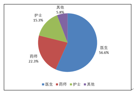 按照?qǐng)?bào)告人職業(yè)統(tǒng)計(jì),醫(yī)生占56.6%,藥師占22.3%,護(hù)士占15.3%,其他職業(yè)占5.8% (圖4)。