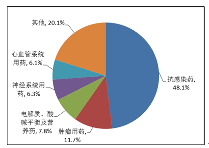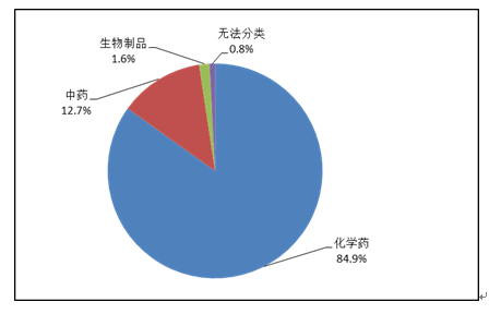 按照藥品類別統(tǒng)計(jì),化學(xué)藥品占86.6%,中藥占12.6%,生物制品占0.8%?;瘜W(xué)藥品排名居前的藥品類別是抗感染藥、心血管系統(tǒng)用藥、腫瘤用藥、神經(jīng)系統(tǒng)用藥、電解質(zhì)、酸堿平衡及營(yíng)養(yǎng)藥;中藥排名居前的藥品類別是理血?jiǎng)⒀a(bǔ)益劑、祛濕劑、開(kāi)竅劑、清熱劑。