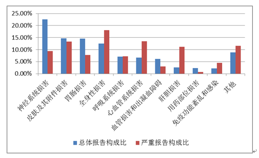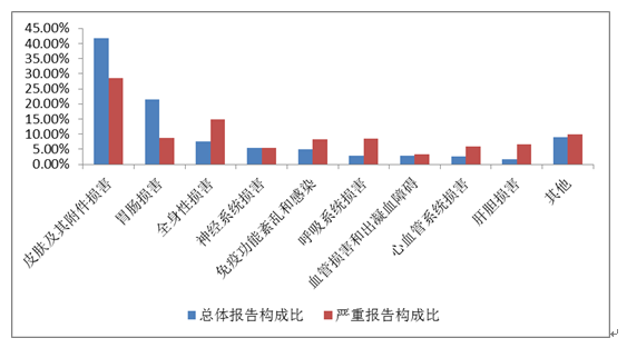 抗感染藥整體藥品不良反應(yīng)/事件報(bào)告中,口服制劑累及器官系統(tǒng)排名前5位的是胃腸損害、皮膚及其附件損害、神經(jīng)系統(tǒng)損害、肝膽損害、全身性損害;注射劑累及器官系統(tǒng)排名前5位是皮膚及其附件損害、胃腸損害、全身性損害、免疫功能紊亂和感染、神經(jīng)系統(tǒng)損害。