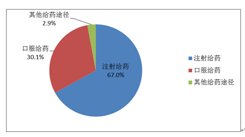 按照藥品給藥途徑統(tǒng)計(jì),注射給藥占67.0%、口服給藥占30.1%、其他給藥途徑占2.9%(圖16)。注射給藥中,靜脈注射給藥占92.7%、其他注射給藥占7.3%。